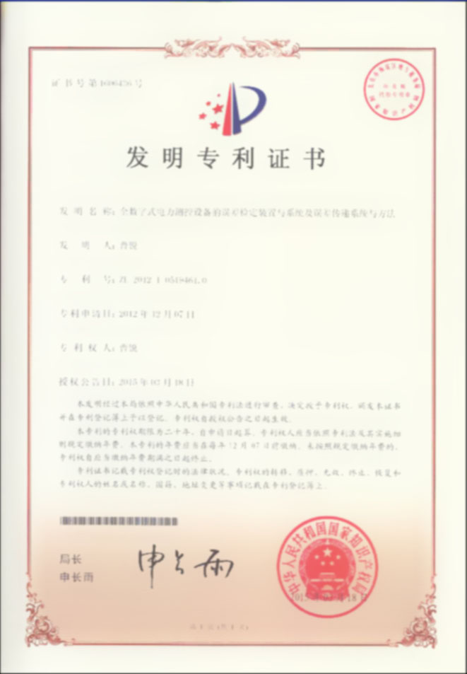 2015年3月,我公司獲得“全數(shù)字式電力測控設(shè)備的誤差檢定裝置與系統(tǒng)及誤差傳遞系統(tǒng)與方法”的發(fā)明專利授權(quán)。