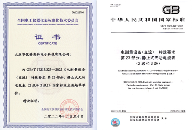 優(yōu)特奧科作為主要起草單位的國家標準《GB/T17215.323-2022電測量設備(交流)特殊要求 第23部分:靜止式無功電能表(2級和3級)》于2022年12月30日發(fā)布,2023年7月1日實施。