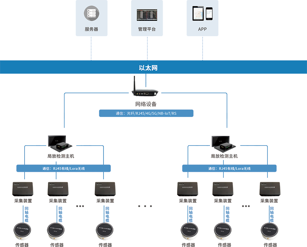 局部放電超高頻檢測(cè)技術(shù)是一種非接觸的檢測(cè)方法,依據(jù)“場(chǎng)”的原理,它通過(guò)天線傳感器接收局部放電過(guò)程中輻射的超高頻電磁波,從而實(shí)現(xiàn)局部放電的檢測(cè)。 開(kāi)關(guān)柜局部放電超高頻法是開(kāi)關(guān)柜局部放電檢測(cè)的一種新型方法。由于超高頻傳感器所接收信號(hào)頻率高、因此受外界干擾影響小,可以大大地提高開(kāi)關(guān)柜局部放電檢測(cè)的靈敏度與可靠性。超高頻傳感器所檢測(cè)的信號(hào),經(jīng)過(guò)同軸電纜送往開(kāi)關(guān)柜局部放電在線采集裝置,進(jìn)行放大、濾波、檢波,數(shù)字脈沖提取、數(shù)字濾波、局放特征量計(jì)算等數(shù)字化處理,并完成局放可視化操作、局放判斷、數(shù)據(jù)存儲(chǔ)、數(shù)據(jù)上送等功能。