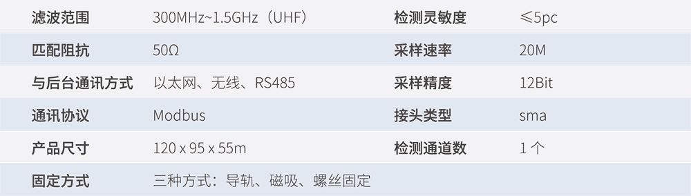 AP3331-608B型局放采集裝置通過(guò)同軸電纜接收超高頻傳感器所采集的局部放電信號(hào),并對(duì)該信號(hào)進(jìn)行濾波、檢波、脈沖提取、數(shù)字濾波、局放特征量計(jì)算等數(shù)字化處理,并進(jìn)行局放判斷、數(shù)據(jù)存儲(chǔ)、數(shù)據(jù)上送等功能。采用嵌入式高速處理器、CPLD 和射頻芯片,保證了高速采集局放信號(hào)和信號(hào)處理。局放采集器與主機(jī)采用多種通信方式,分別有無(wú)線傳輸、RS485 傳輸和網(wǎng)線傳輸。供電方式:12VDC 或者 220VAC。安裝在開(kāi)關(guān)機(jī)儀表室,安裝方式有三種:磁吸附安裝、導(dǎo)軌固定安裝和螺絲固定安裝。