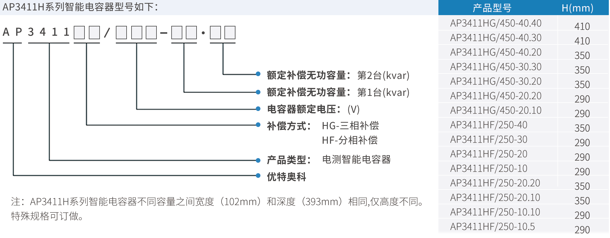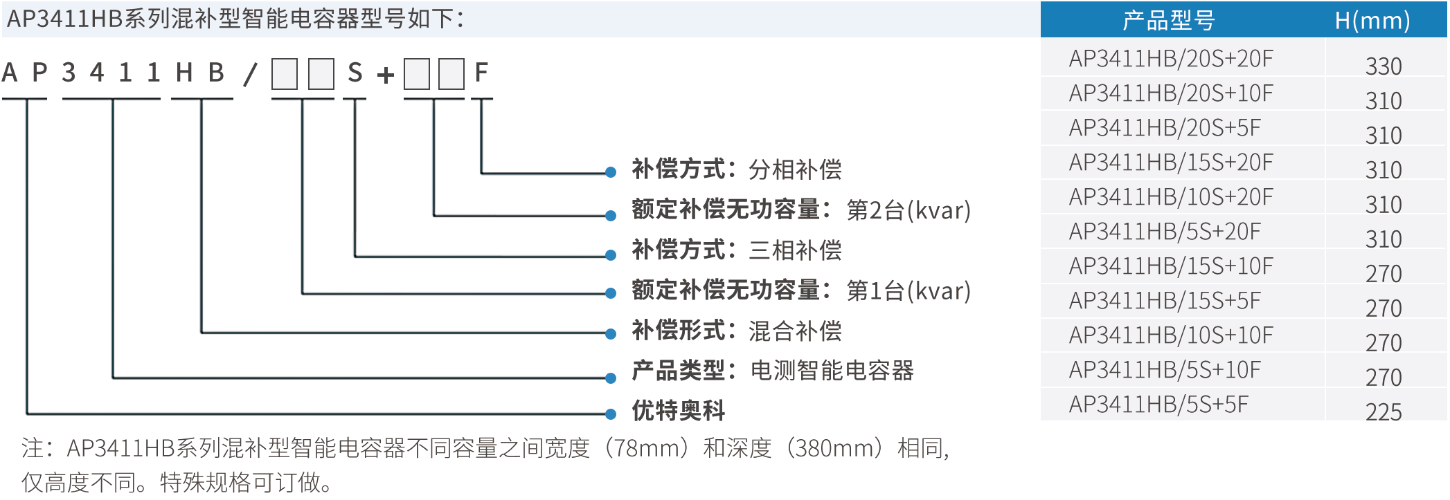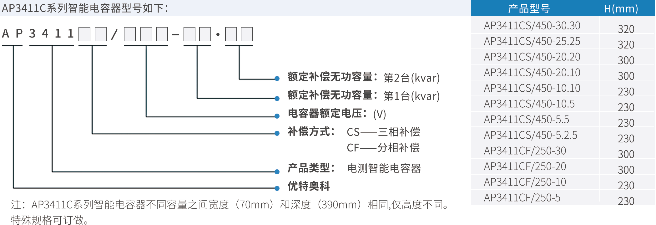 AP3411C系列智能電容器是由智能測控單元、同步零投切開關、智能保護單元、組網(wǎng)單元、顯示單元、兩臺(△型)或一臺(Y型)低壓自愈式電力電容器組成一個獨立完整的智能無功補償系統(tǒng)。產(chǎn)品既可單臺使用,也可多臺組網(wǎng)構成補償系統(tǒng)使用;既可配套AP系列低壓無功綜合測控儀使用,也可使用二次電流互感器直接構成補償系統(tǒng)使用;既可三相補償,也可三相和分相混合補償。AP3411C系列智能電容器應用于電網(wǎng)諧波含量較低的低壓電力系統(tǒng)中,可靠運行,提高系統(tǒng)功率因數(shù),降低線損,提高電網(wǎng)電能質量。 AP3411H系列智能電容器,除具備AP411C系列產(chǎn)品的所有功能外,還可以實現(xiàn)更大補償容量(40+40)Kvar,更大分斷能力(采用塑殼斷路器)Icu≥20KA。 AP3411HB系列混補型智能電容器是由智能測控單元、零投切開關、智能保護單元、一臺(△型)和一臺(Y型)低壓自愈式電力電容器組成一個獨立完整的智能補償單元,替代由智能無功控制器、熔絲(或微斷)、晶閘管復合開關(或接觸器)、熱繼電器、低壓電力電容器多種分散器件組裝而成的自動無功補償裝置。